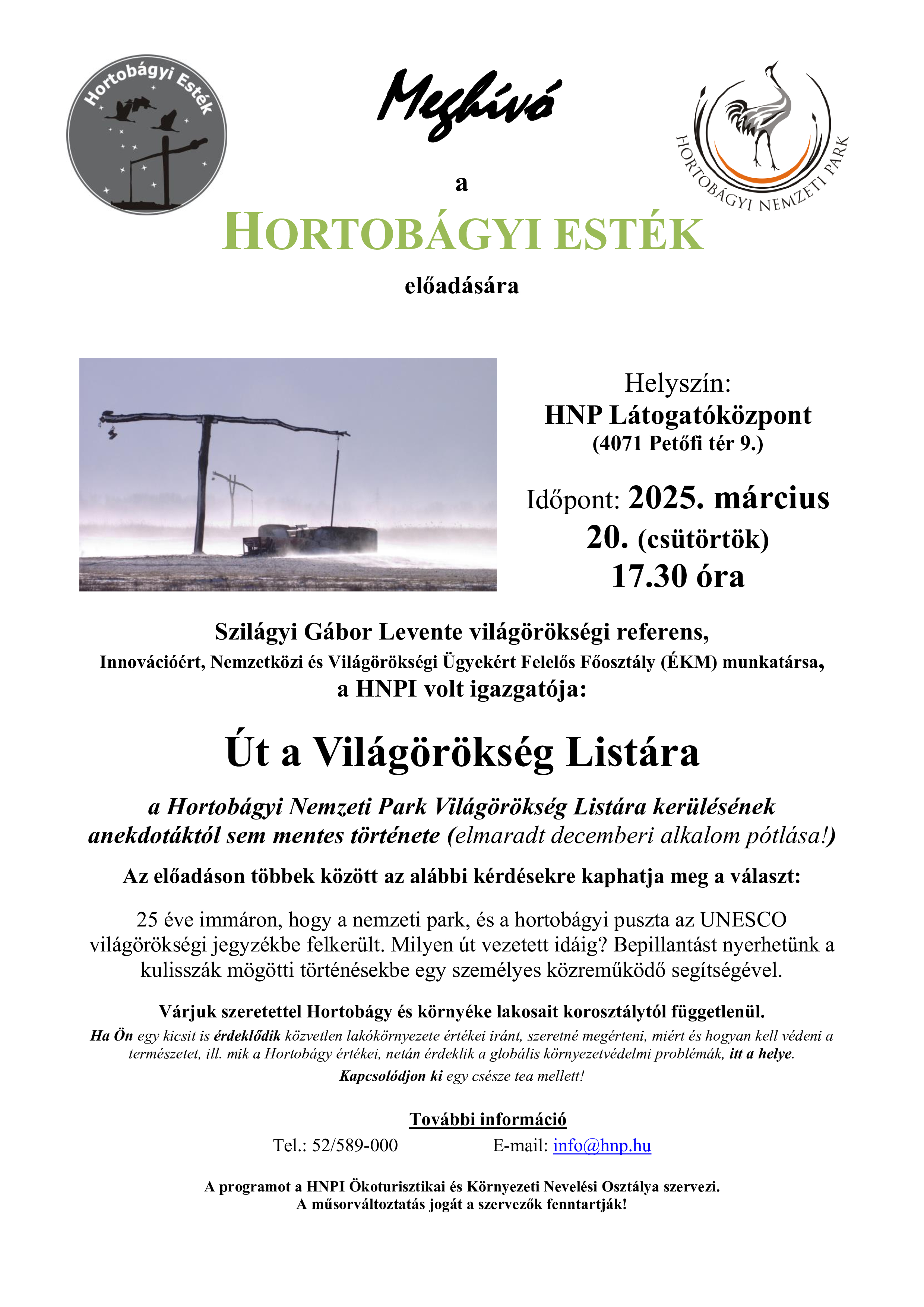Helyszín: HNP Látogatóközpont, 4071 Hortobágy Petőfi tér 9.